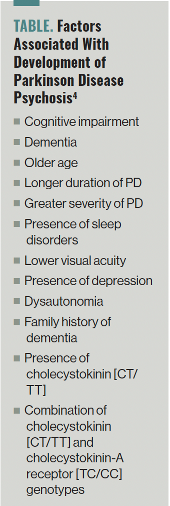 A meta-analysis by Chendo et al discovered that amongst people with PD, the pooled frequency of psychosis (hallucinations, delusions, and minor psychotic phenomena, together with sense of presence, passage hallucinations, and illusions) was 20.7%.3 In one other research, the investigators famous that visible hallucinations have been current in roughly 1 / 4 to a 3rd of people with PD and auditory hallucinations have been seen in about 20% of the people. Minor phenomena have been seen in roughly 17% to 72% of the people and delusions have been famous amongst 5% of the folks with PD.4 In keeping with information, additional components related to the event of PD psychosis (PDP) may be discovered within the Desk.4